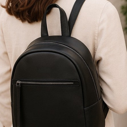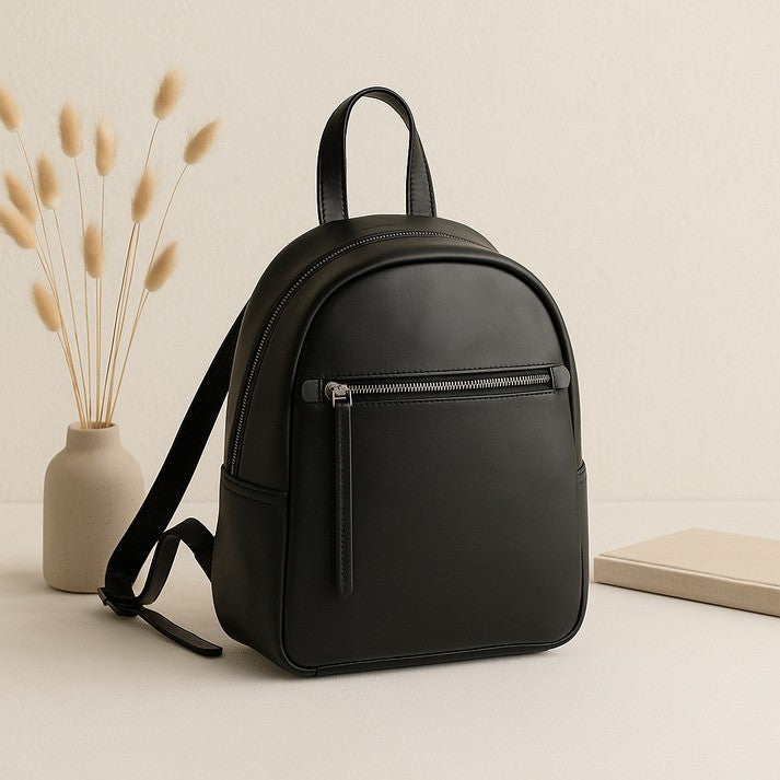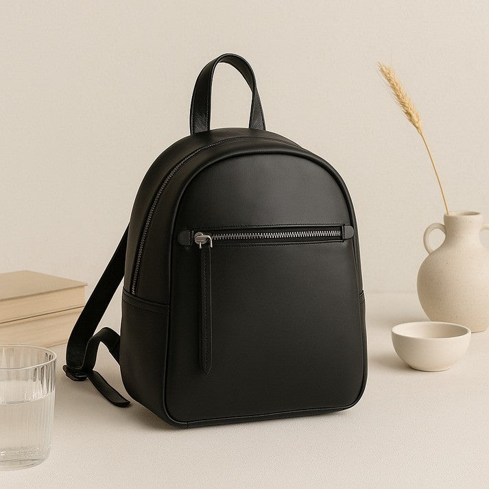GM Leather Auckland black full-grain leather mini backpack for women, stylish small leather bag with zipper details, perfect for everyday use or local purchase at Lynnmall New Lynn NZ