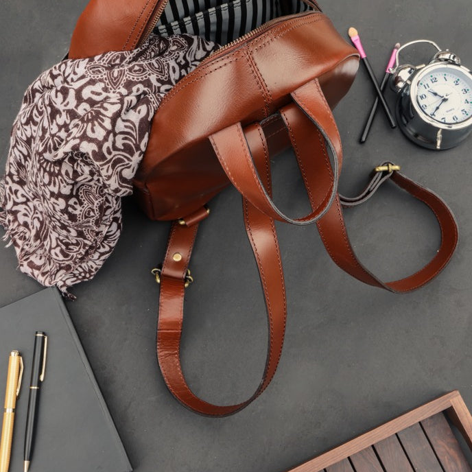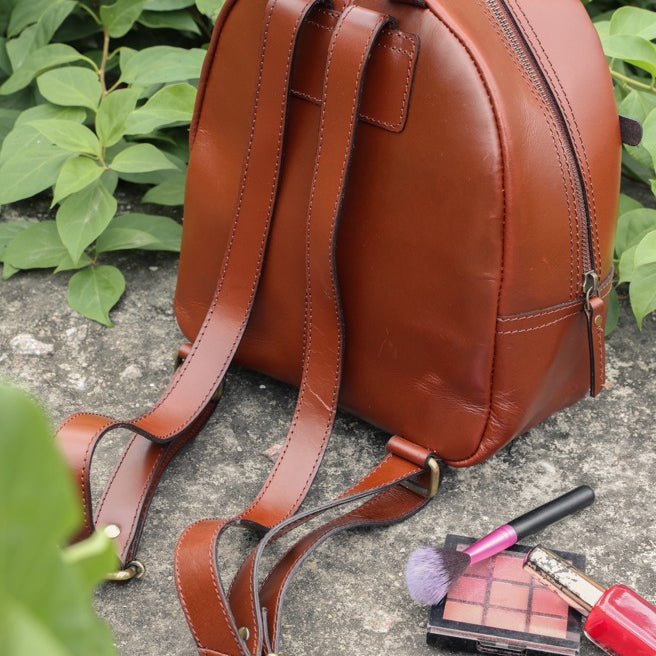 GM Leather Auckland brown full-grain leather mini backpack for women, stylish small leather bag with zipper details, perfect for everyday use or local purchase at Lynnmall New Lynn NZ.