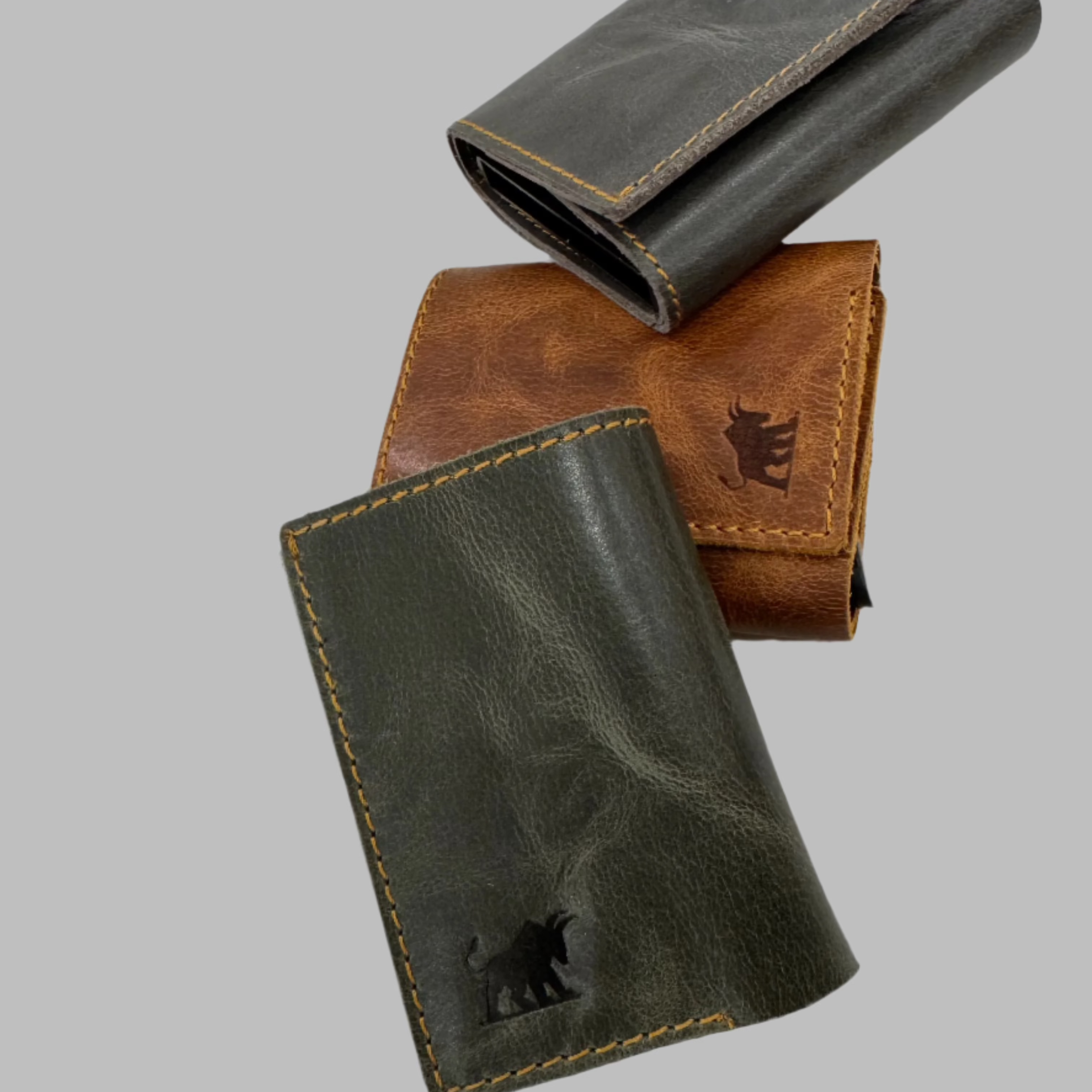 Brown leather wallet with 'G.M. Leather' branding on a white background A blue leather card holder with the brand name 'GMLEATHER' embossed on the bottom right.