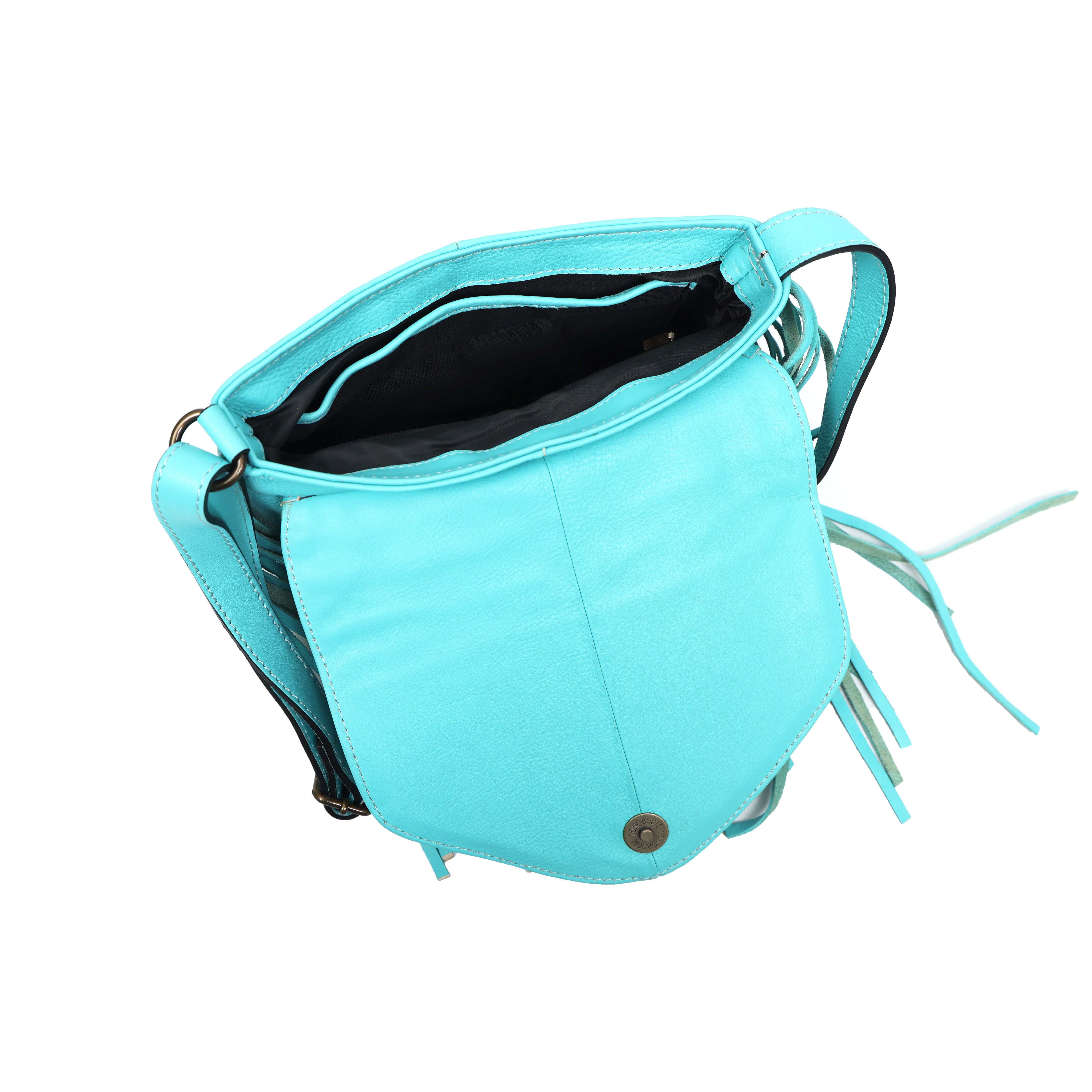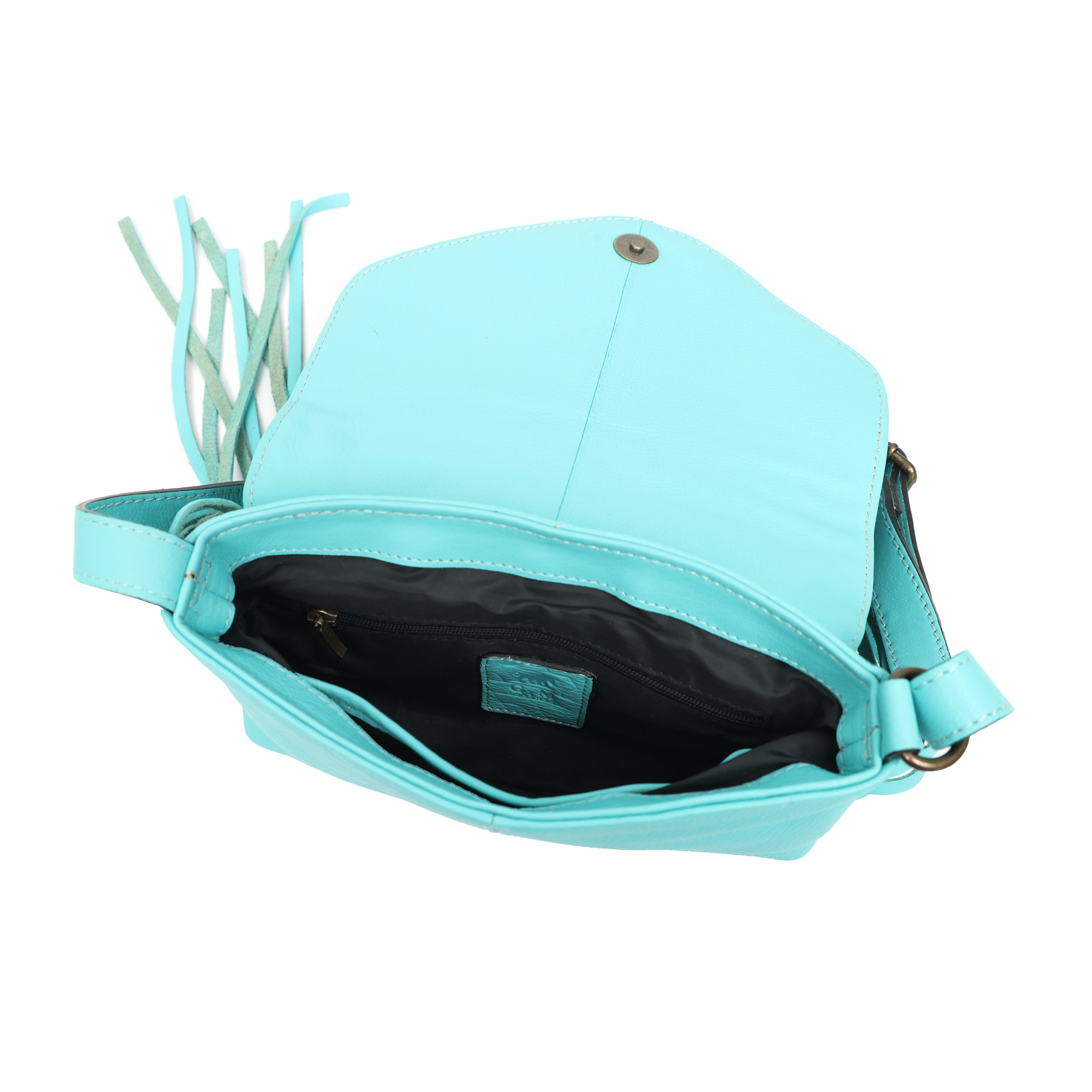 Turquoise handbag with fringe and embroidery on a gray background Brown leather handbag with decorative patterns on a gray background Embroidered handbag with fringe on a gray background Turquoise handbag with fringe details on a white background Front view of a beige leather crossbody bag with brown floral embossing, tan woven detailing, and light blue fringe tassels, displayed on a white background. Front view of a tan leather crossbody bag with turquoise woven detailing, brown floral embossing, and long fringe tassels, displayed on a white background. Black leather crossbody bag with fringe details on a white background The Mahiya Coachella Bag is a hand-tooled leather crossbody bag that can also be used as a clutch by removing the strap. It is designed with a bohemian aesthetic, featuring tassels, fringe, and detailed leather work.