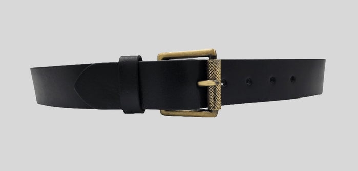 A black leather belt with a brass buckle, displayed on a plain background.